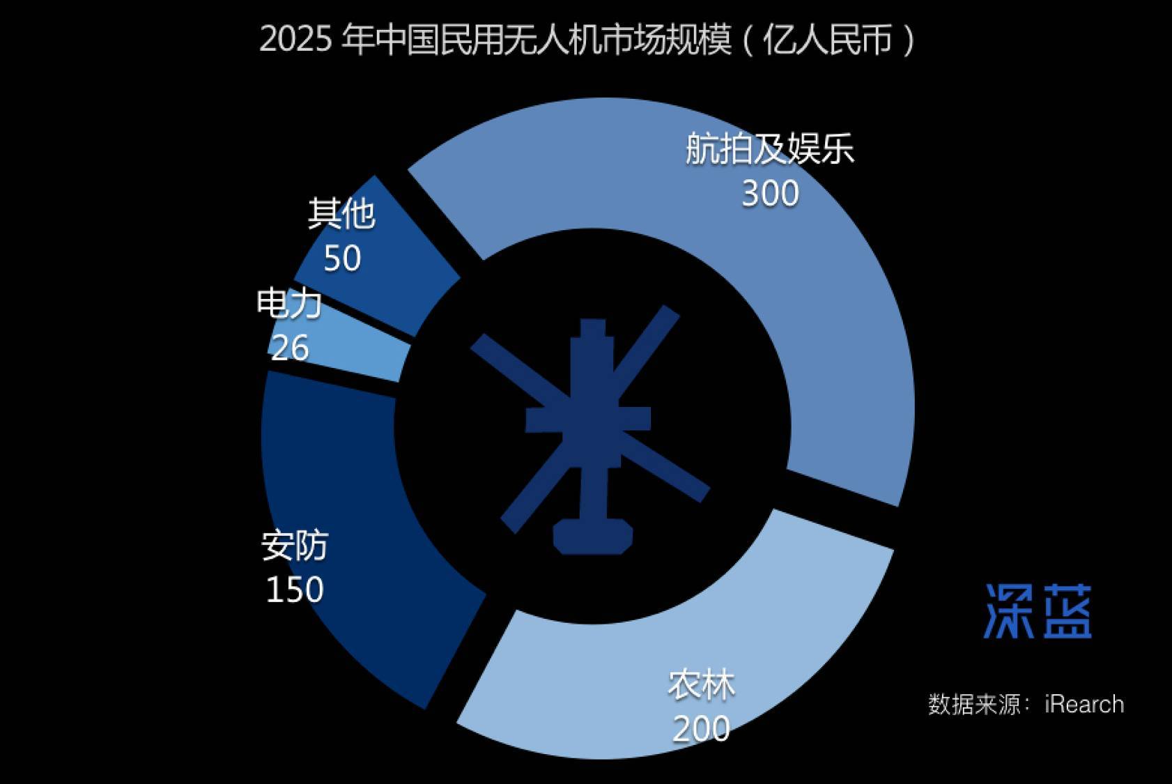 预计到 2025 年,国内无人机航拍市场规模约为 300 亿,农林植保约为 200 亿,安防市场约为 150 亿, 电力巡检约为 50 亿,总规模将达 750 亿。