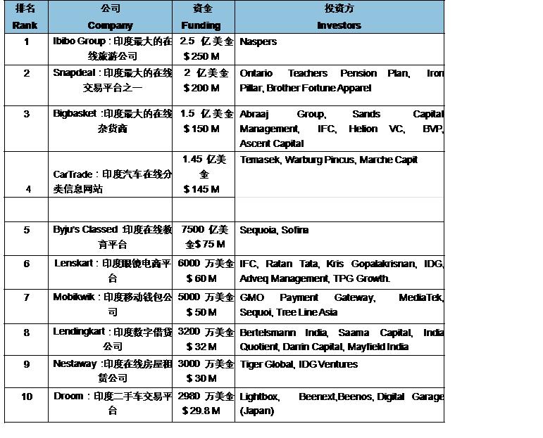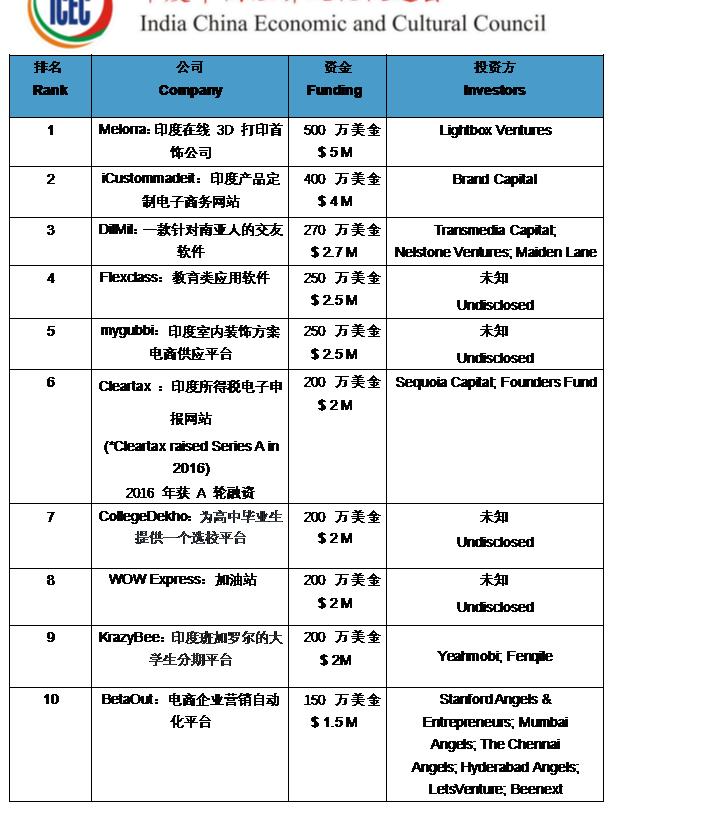 2016印度十大被投资初创企业(截至2016年7月30日):
