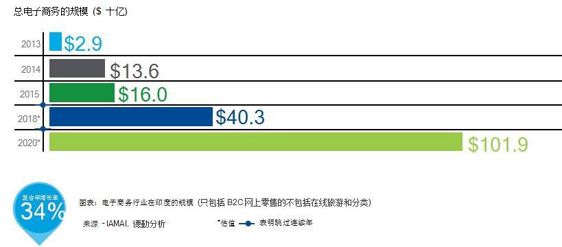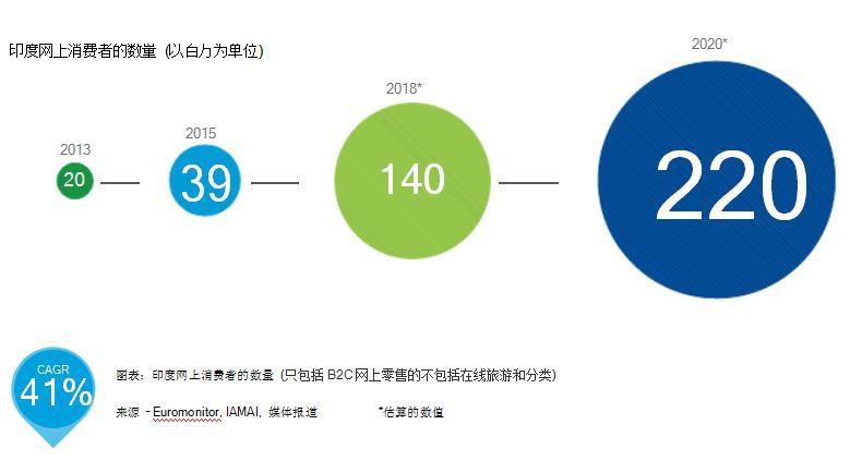 印度经济不断展现出增长的活力。2015-16 财年,印度 GDP 增长率达到 7.5%,一举超过中国,成为发展最快的国家。消费复合年增长率保持在 11%,预计整个消费市场将从现在的 6000 亿美元达到 2020 年的 1 万亿美元。同时,印度也是一个年轻的国家,全国 65%的人口年龄都在 35 岁以下,平均年龄 26.5 岁。随着世界互联网技术的深入,印度人民在不断适应新技术。到 2015 年 9 月,印度拥有 3.54 亿网民,而此数据到 2019 年将达到 6.57 亿。增长速度如此之快在于不少网民直接通过移动工具上网,直接舍弃桌面终端这一步。目前印度已经超越美国,成为世界第二大移动终端市场。