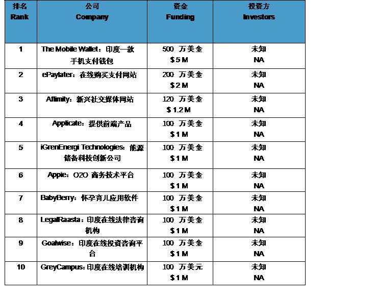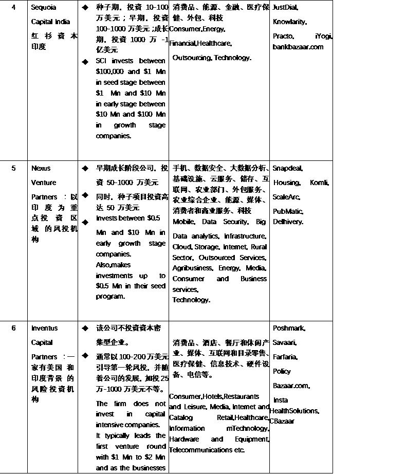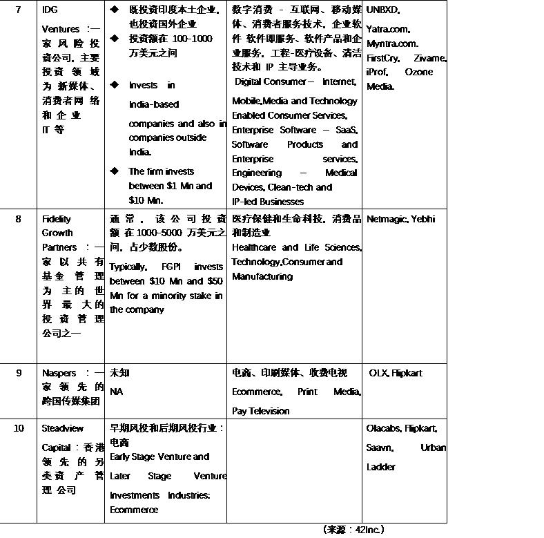 • 其它自 2009 年以来,对印度融资具有重要影响的外国投资者包括 500Startups(由 Dave Mclure 及 Pankaj Jain 创办),以及 Inventus Capital Partners 等。