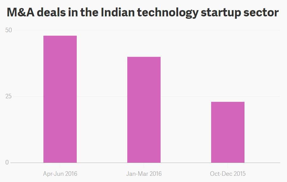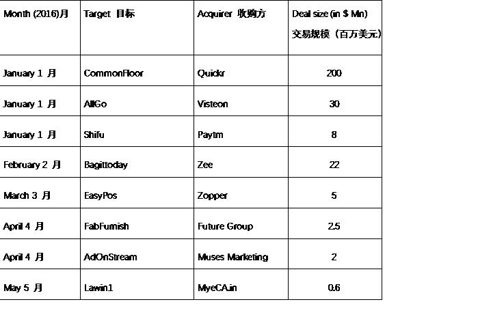 在 2015 年底,一个趋势进入我们的视野,那就是印度初创企业被广泛收购。根据 NASSCOM,至 10 月以来总共 65 家初创企业被更大公司收购。另外,大多数这些交易都发生在国内企业之间。Housing.com 收购 Realty BI, Dwll.in 被Livspace 收购。在 2016 年,41 家初创公司被收购,仅两起收购是同行业中更大的竞争对手——Mahindra 和 Godrej。Ola 以 2 亿美元收购 TaxiForsure,Snapdeal 以 4 亿美元收购 Freecharge,进一步帮助初创生态系统风险投资建立信任和信心。