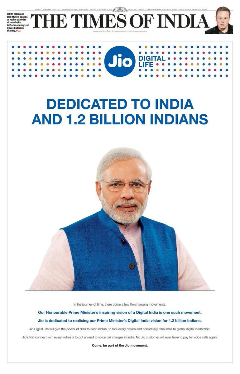 有趣的是,在《印度时报》的广告上,Jio将印度总理莫迪照片放在了广告中,看起来就像莫迪代言了这家企业,Twitter上不少人都在吐槽Jio的“心机”。