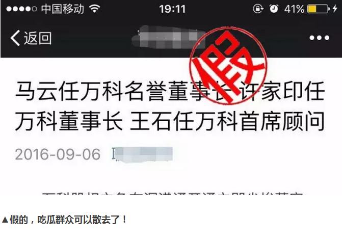 随后,万科官方晚8点44分通过万科周刊官方微信辟谣,并附上一句话:假的,吃瓜群众可以散去了。