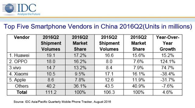 2016年第二季度,小米出货量下滑,降至第四名。