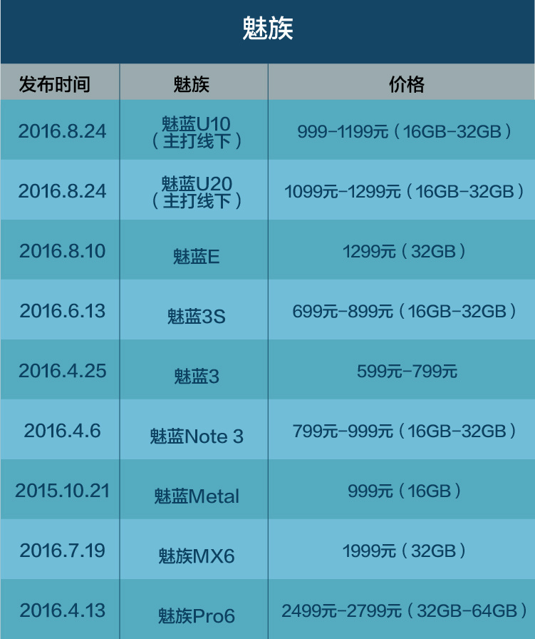 今年魅族已发布的9款机型,以每款差价100元的差别上,覆盖了599元到1299元的价位段。而以往,魅族、小米,一年只推出1-2款机型,价位段的差距是500元至1000元。