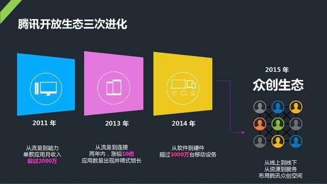 其实腾讯并非一开始就专注生态,反而因“抄袭”广为创投圈和舆论界诟病,直到六年前那场“3Q大战”和《计算机世界》一篇封面头条,腾讯被推至舆论风口,马化腾才开始痛定思痛,开展“诊断腾讯”活动。反思后,腾讯提出封闭自保的模式已经走到尽头,必须拥抱全新的开放生态时代,之后马化腾定下开放平台第一阶段的目标:“再造一个腾讯,一个外部的腾讯,一个大家的腾讯”。