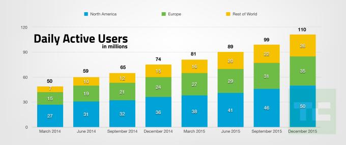 同样,在2015年12月,Snapchat拥有1.1亿日活用户,同比上涨了将近50%,在此之前几个月用户增长甚至比这更快。