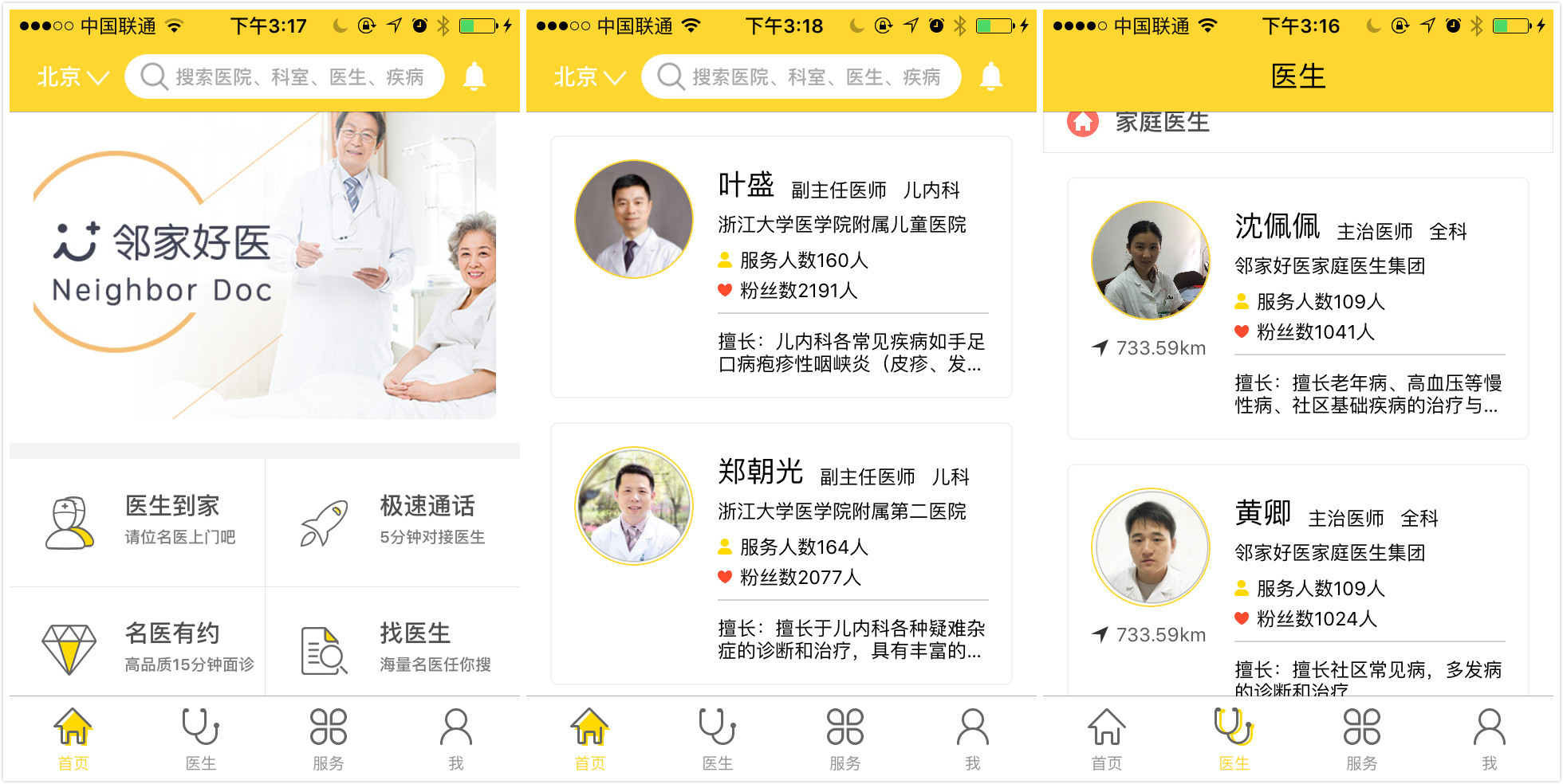 从邻家好医APP上可以看到,邻家好医能在线上为用户提供极速通话、图文电话咨询、面诊、转诊等服务,服务的医生既包括三甲医院主治以上的专科专家,也有包括从事基层和社区临床医疗的全科医生。