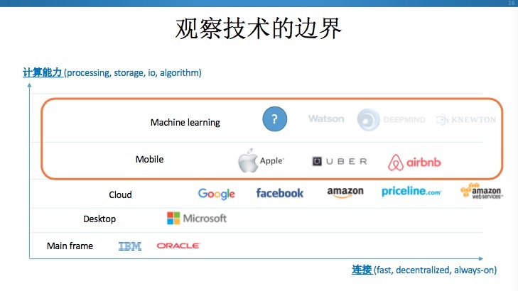 我在观察机会的时候会用到这样一个方法,我叫做“技术的边界”。在我的世界观里面技术边界主要是有两股力量推动的,一股力量叫做计算能力,就是存储、人机交互、还有算法,都在不断的进步。还有一个驱动力就是连接,就是我们会发现互联网在从慢变快,从只有PC变到可以移动,从不连续的变到现在能够永久在线,以后可能万物互联。这两股力量是把技术边界在不断的往右上角推动,当这个技术边界碰到了一些刚性的需求就会产生巨大的机会。