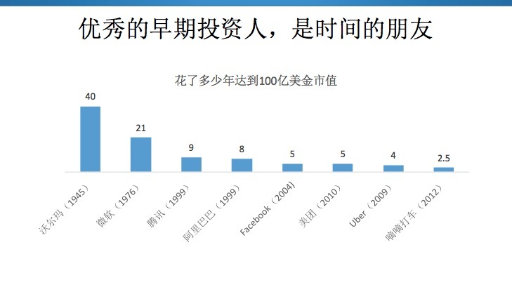 还有我选择做早期投资,也是为了要做时间的朋友。大家看这样的一个数据,就是我总结的,不同时代的这些最顶级的公司他们花了多长的时间达到100亿美金,我发现这个时间越来越短,沃尔玛花了40年,微软花了21年,腾讯阿里巴巴分别花了9年和8年,Facebook花了5年,优步花了4年,滴滴打车只花了2.5年,这个过程越缩越短,而且我发现很多的公司他资产越来越轻,资本效率越来越高,到后面就不需要融资了,所以早期投资人是时间的朋友。