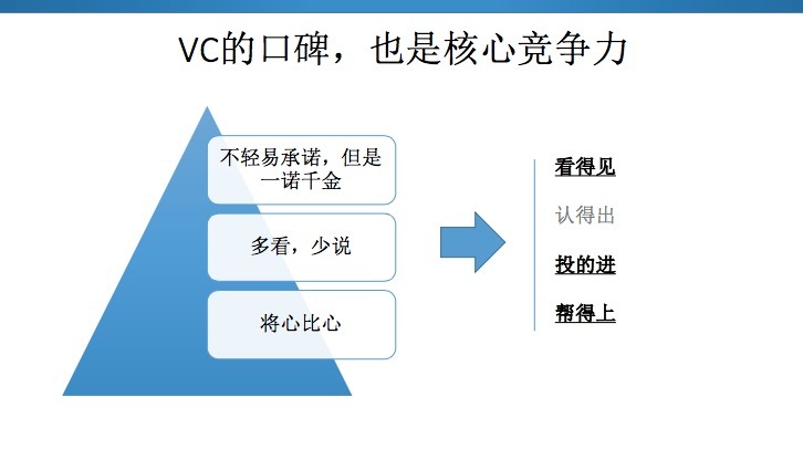 其实在VC行业也有类似的东西,我总结就是“VC的口碑也是核心竞争力”。其实真正要做一个好VC,要做好的无非就是这么几点:你要看得见的好项目,认得出来,投的进去,帮得上忙。其实这几点里面大部分(黑体字的三点)都是要依赖你的品牌和口碑的。