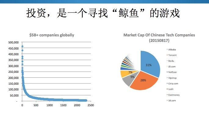 那右面这张图是中国的,这个数据稍微有一点老,但是最新的数据他的形状是一样的,就是中国所有上市的高科技公司,我们把他做成了一张饼图,你会发现绝大部分的市值集中在个位数的公司身上,非常少数的公司占了大部分的市值。所以,做投资其实就是要抓住这些鲸鱼。