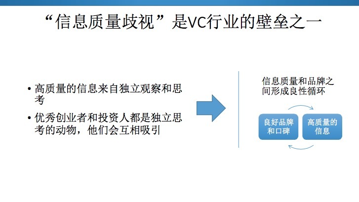 那这样的一个共生关系就让新进入的竞争对手没有机会积累这个经验,而这个经验就是这个行业最重要的东西。那反过来看VC行业,我发现有一个东西挺有意思的,就是信息质量歧视,我觉得信息质量歧视是VC行业重要的壁垒。这是什么意思呢?我认为高质量的信息来自独立观察和思考,优秀的创业者和投资人都是独立思考的动物,而且他们会互相吸引。那这些就导致了信息质量和品牌之间会形成一个良性循环,你有良好的品牌和口碑你就会获得更高质量的信息,你有更高质量的信息你就可以不断的巩固品牌和口碑,他们两个会形成良性循环。