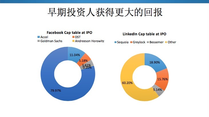 而且我还有一个观点,就是其实最厉害的投资人,都是在这些公司很小的时候投进去的。你去看这两张图,Facebook 和 Linkedin,其实他们最大的股东不是投钱投的最多的。Facebook上市的时候ACCEL占了11%的股份,Linkedin上线的时候红杉占了18.9%,他们都是这里面投钱投最少的股东,但是就是投的足够早。