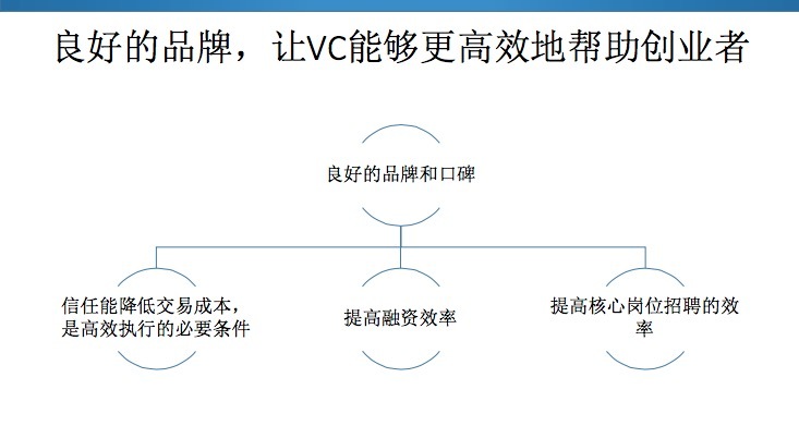 信任能降低交易成本,是高效执行的必要条件,一个好的VC的品牌可以帮助他投的企业提高他的融资效率,他要见下一轮投资人的时候,可能后期的投资人也会对这个企业产生更多的信任,他在招聘核心岗位的时候这个候选人可能也会因为他背后的这个VC的品牌而更相信这家企业,提高这个核心岗位的招聘的效率。