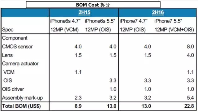 对于纯摄像头的供应商,实际上双目的售价会比单目高出约20-30%(每摄像头价格),所以摄像头的厂商的营收增加值会在30-50%之间(营收角度)。除了摄像头成本增高意外,加工的工艺成本也在上升。IPhone 7系列每个摄像头模块的组装成本会增加50%。对于整个手机摄像头模块,除了纯粹的镜头外,还需要考虑的就是感应器和摄像头模组(CCM)的市场需求。其中Sensor的供应商太集中且逻辑更为简单粗暴(就是增加sensor的安装,很单纯的是带来出货量的上升,ASP并不会上升),因此不单独进行讨论。另外,今天和相关行业人士聊了之后,其认为Iphone 7 plus的现实成本是要上40usd -- 两颗1200万像素模组组成:其中一颗为长焦镜头,另一颗为负责成像功能的广角镜头;不仅能够实现两倍无损光学变焦效果,还能完成10倍的数码变焦兼有背景虚化等成像效果。