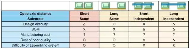 不同的双目摄像头组装方法都有不同的优缺点,现在双目的拼装主要分成是否共基板以及长短光轴间距:长短目距就是两个摄像头之间的距离吗,像Iphone 7 plus的双目摄像头就是属于短目距的,是否是共基板就是两个摄像头是不是用的同一个基板连接(下图的黄色下划线表示的就是基板),如果不是共基板一般都需要支架把两个摄像头连接到一起,也就是双目共支架的方式(下图中蓝色线段表示支架)。