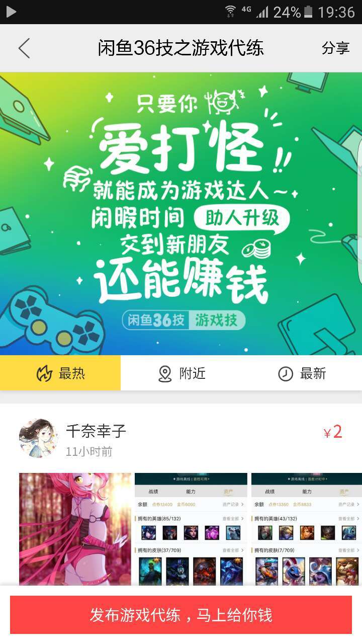 就在两天前,闲鱼上线了技能共享接口,产品首页 Banner 上出现了闲鱼36技,比如游戏代练、口语陪练等技能共享服务都在明码标价,这种跟知乎、在行非常类似的知识共享其实也是闲鱼重社区属性的结果。