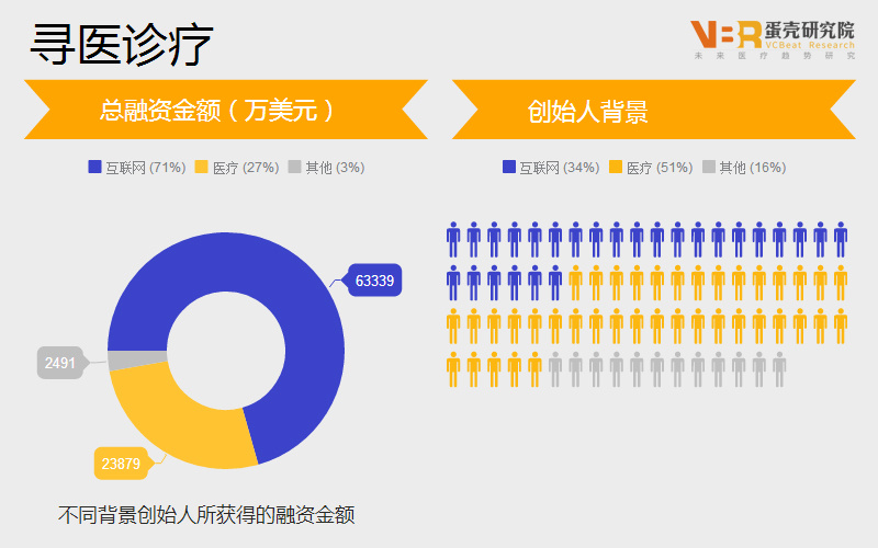 进入到这个领域的企业数量多,背景复杂。其中医疗背景的人还是占了多数,但是从融资的额度来说互联网人却占了绝对的优势。这也和寻医诊疗最为市场化、用户数量高有直接的关系。