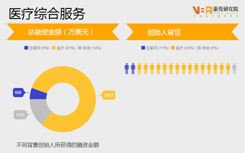 以上我们分析了9大细分领域的企业背景和融资情况、创始人背景。从企业成功的概率来看,市场上关于互联网+医疗还是医疗+互联网的争议是有道理的,不同的创始人背景,决定了企业的发展基因,有着非常不一样的发展轨道和走势。