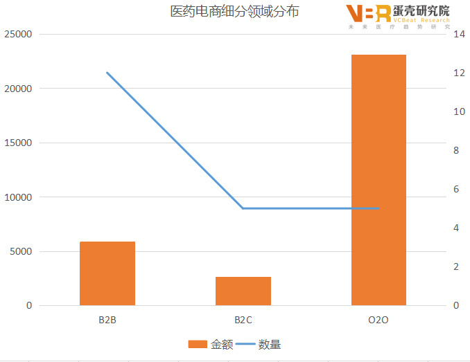 医药电商分成四种类型,第一种是自营医药B2C,第二种是自营医药B2B,第三种是医药O2O,第四种是平台医药B2C。第四种主要是成熟大型电商平台,比如天猫,1号店,他们当然没有包含在我们统计的创业公司在内。而第二种B2B平台最多,占我们统计23家中的12家,O2O平台则有4家,但是融资额度远高于其他类别的企业。