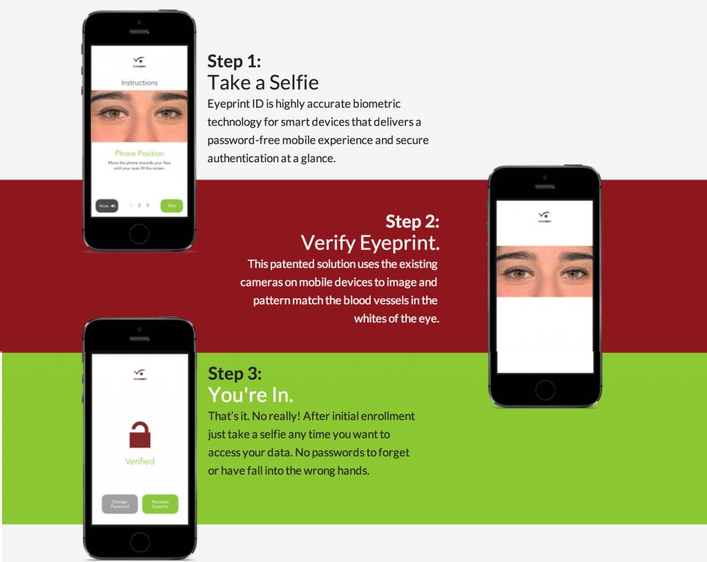 EyeVerify的主打产品Eyeprint ID主要通过眼纹 (即眼白纹理结构) 识别用户身份;通过智能手机摄像头捕捉每只眼睛中的眼纹,用户将手机平举在身前,只要盯着手机摄像头,向两侧转动眼球即可。拍摄到眼球的眼白区域后,软件会分析照片中眼球的血管分布图,为用户建立独有的 ID 数据。
