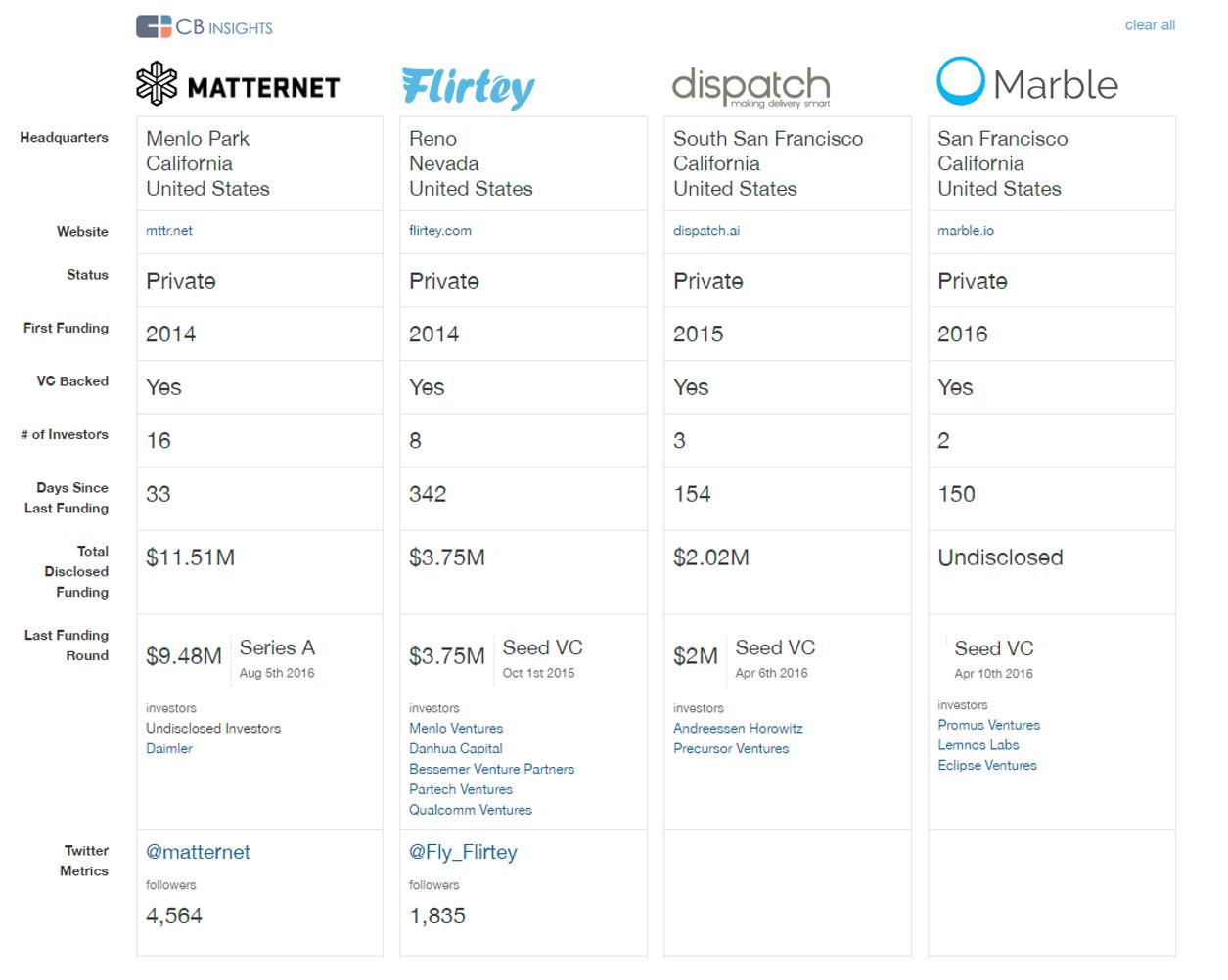 CBinsight最近公布的一张表单,标出了四个尚处于早期阶段的初创公司,他们都想要通过无人机或是无人车配送解决这最后一英里问题。