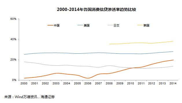 还有一个明显的差异是在汽车贷款领域,在美国占比8%,中国占比4%,中国整个汽车市场保有量突破了1.5亿台,新车销售的金融渗透率还会进一步上升,二手车2015年的交易量接近1000万台(去除重复交易估计为400万台),金融渗透率估计在10%左右,市场才刚刚起步。中国的消费信贷渗透率在不断上升,目前在20%左右,低于美国和韩国的水平,未来还有巨大的发展空间,尤其是目前没有信用卡的蓝领人群。