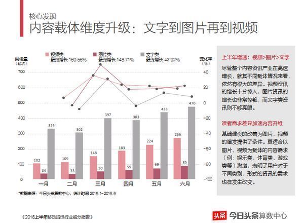 此前,今日头条曾发布过一份上半年的移动资讯分析报告。报告显示,伴随着3G与4G网络的普及、WiFi的大面积覆盖、运营商的资费降低,更具冲击、吸引的视频资讯开始被更多的移动用户接受。视频资讯的阅读量增长十分惊人,从1月份的102亿次增长到6月份的266亿次,增幅高达160%。时尚、财经和科技类资讯在视频资讯增长迅速的背景下,总体渗透率仍然偏低,在视频内容创业上有巨大潜力。