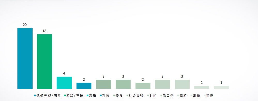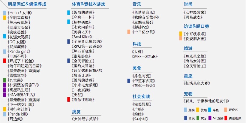 梳理结果发现,偶像(或明星)养成/真人秀和游戏竞技类综艺产品数量最为集中。图表中,我们用不同色块标出了各平台里的头部直播综艺节目。