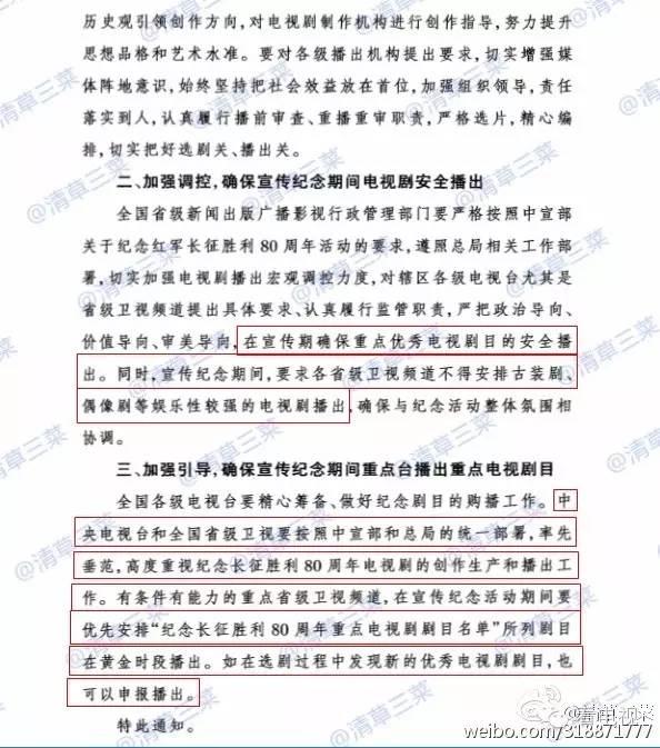 日前,电视剧司发布了《关于开展纪念长征胜利80周年优秀电视剧展播的通知》,列出了包括11部剧在内的“纪念长征胜利80周年重点电视剧剧目名单”。通知强调,“宣传纪念期间,要求各省级卫视频道不得安排古装剧、偶像剧等娱乐性较强的电视剧播出”。这可能是和“玄幻、古偶无缘黄金档”谣言最接近的“总局大招”。