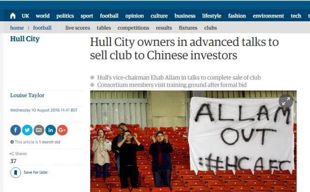 早在上个月初,英国卫报首先爆料来自中国的人和商业控股有限公司极有可能收购刚刚升上英超的胡尔城俱乐部。而当时的胡尔城队中,教练布鲁斯愤然离开,群龙无首,转会市场上毫无作为,加上伤病累累,一线队的报名人数居然只有13名。