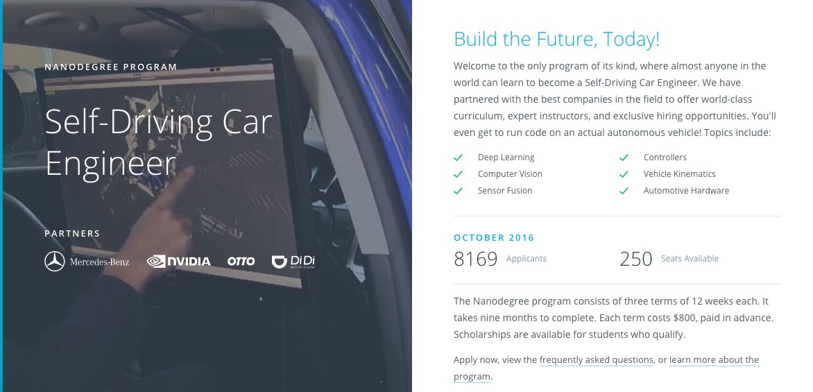 不久前,优达学城(Udacity)向 36 氪表示,他们即将上线一个“无人驾驶车工程师”的纳米学位项目,课程的合作方是梅赛德斯-奔驰、NVIDIA、刚被 Uber收购的 Otto。优达学城表示,希望用这套在线学习的课程为无人驾驶行业培养优秀技术人才,改变人类的未来出行体验和全球交通格局。
