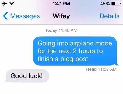 如果你有小孩的话,可以试着在他们睡着的时候工作。下图是我在进入 “专注模式”前,发给我妻子的短信截图: