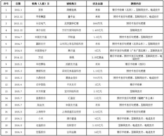 近几年关于支付牌照的收购情况列表如下: