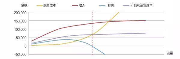 (用户规模扩大时,总体质量的下降产生所谓的“ROI瓶颈”,此时投入越多,亏损越大。)