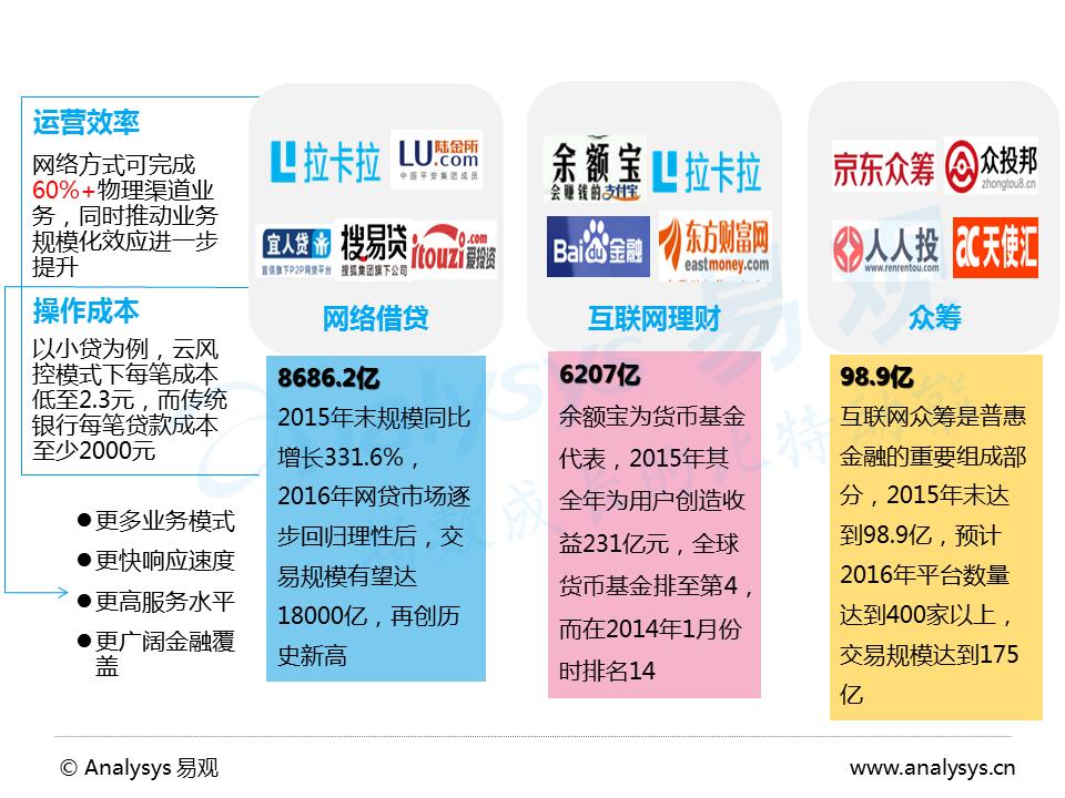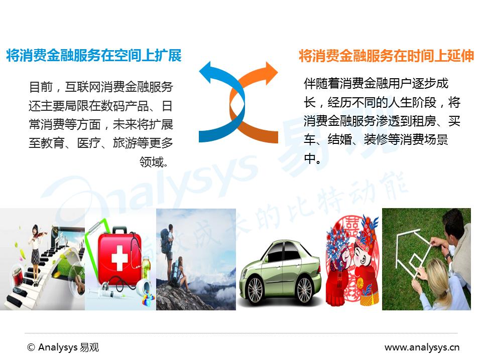 Analysys易观分析认为,普惠金融面向的农民、城市低收入群体等收入虽低,但是对于租房、结婚、家电、装修等消费是刚性需求,大众参与途径与门槛获得提升后,消费金融在这些市场将有很大的增长空间。