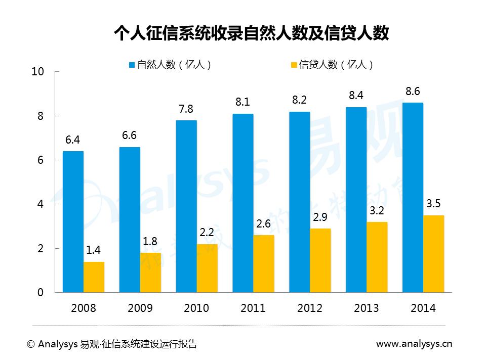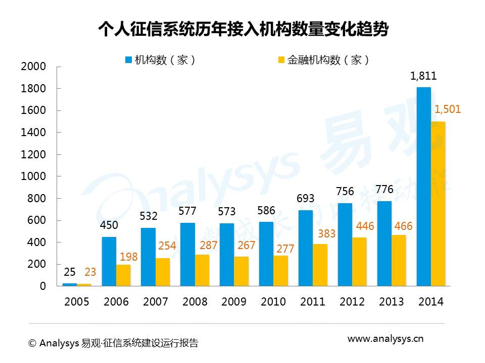 经过十年努力,征信系统接入机构数量逐年增加,目前企业和个人征信系统基本覆盖全国信贷市场,截至2014年底,企业和个人征信系统接入机构数分别为1724 家和1811 家。