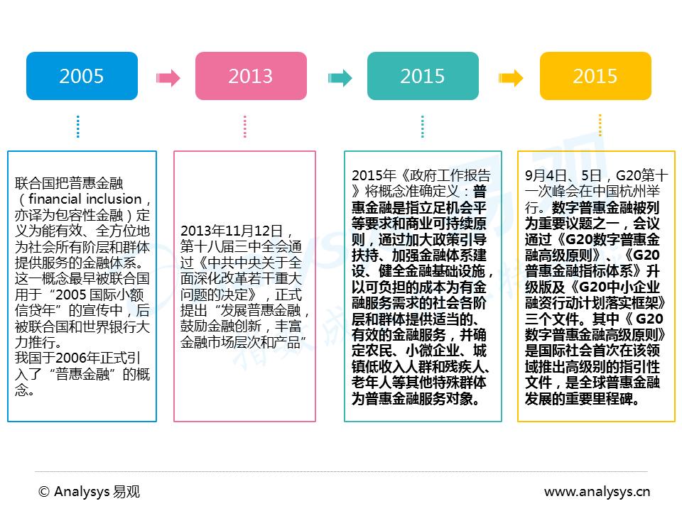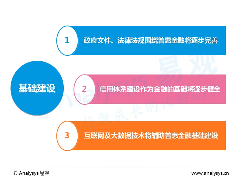 Analysys易观分析认为,随着国家对普惠金融的提倡以及对互联网金融的重视,针对互联网金融的法律支付和监管政策将逐步完善,普惠金融监测指标体系有望从局部到整体得到建立。