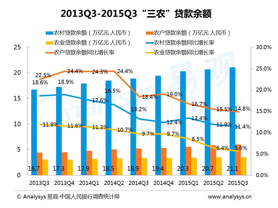从三农贷款的增长情况看,从2014年末的19.4万亿,至2015年Q3增长至21.1万亿,贷款余额增速在逐渐放缓,为更好的支持三农,需要农村金融产品和服务方式创新来不断适应现代农业发展要求。
