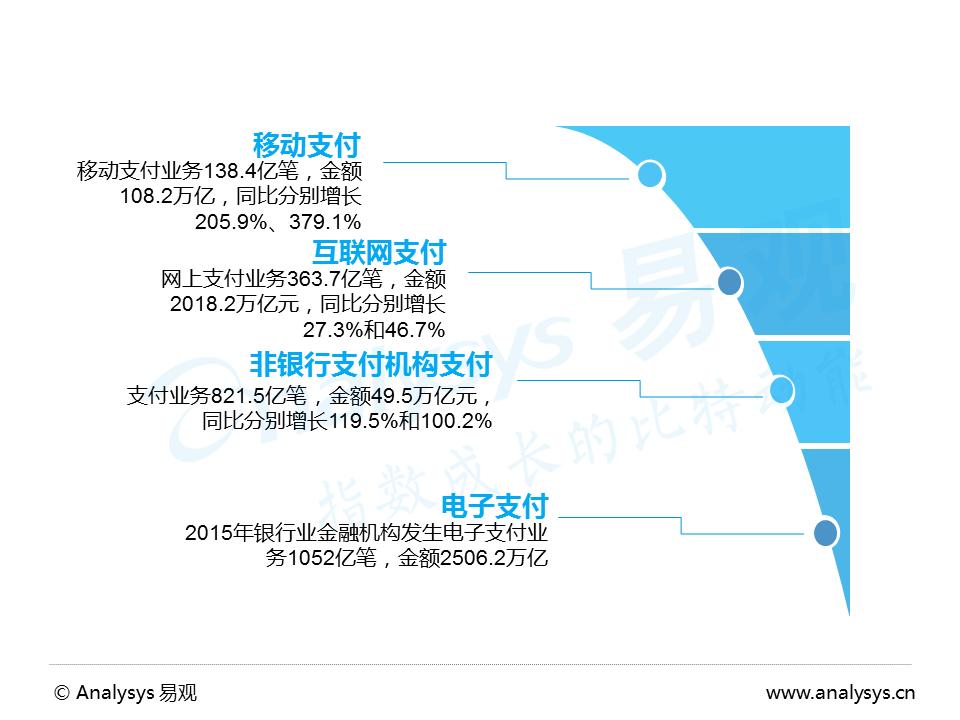 据《中国互联网络发展状况统计报告》显示,截至2015年12月,中国网民规模达6.88亿人(当前为中国网民规模达7.1亿),互联网普及率达到50.3%,手机网民规模达6.20亿,互联网及移动互联网已经改变社会生活形态、金融消费形态,从支付数据上看,2015年电子支付成为大众广为接受并迅速提升操作方式,“科技+金融”推动金融服务突破物理限制,使得服务呈现规模化、移动化发展。