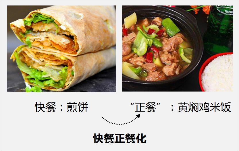 快餐正餐化——过去的快餐(比如肯德基或者肉夹馍),因为太不像中国人理解的“正常的一顿饭”,吃了之后好像这顿饭吃得不正常,所以出现了让快餐变得更像“正常的一顿饭”的方式,例如黄焖鸡米饭。