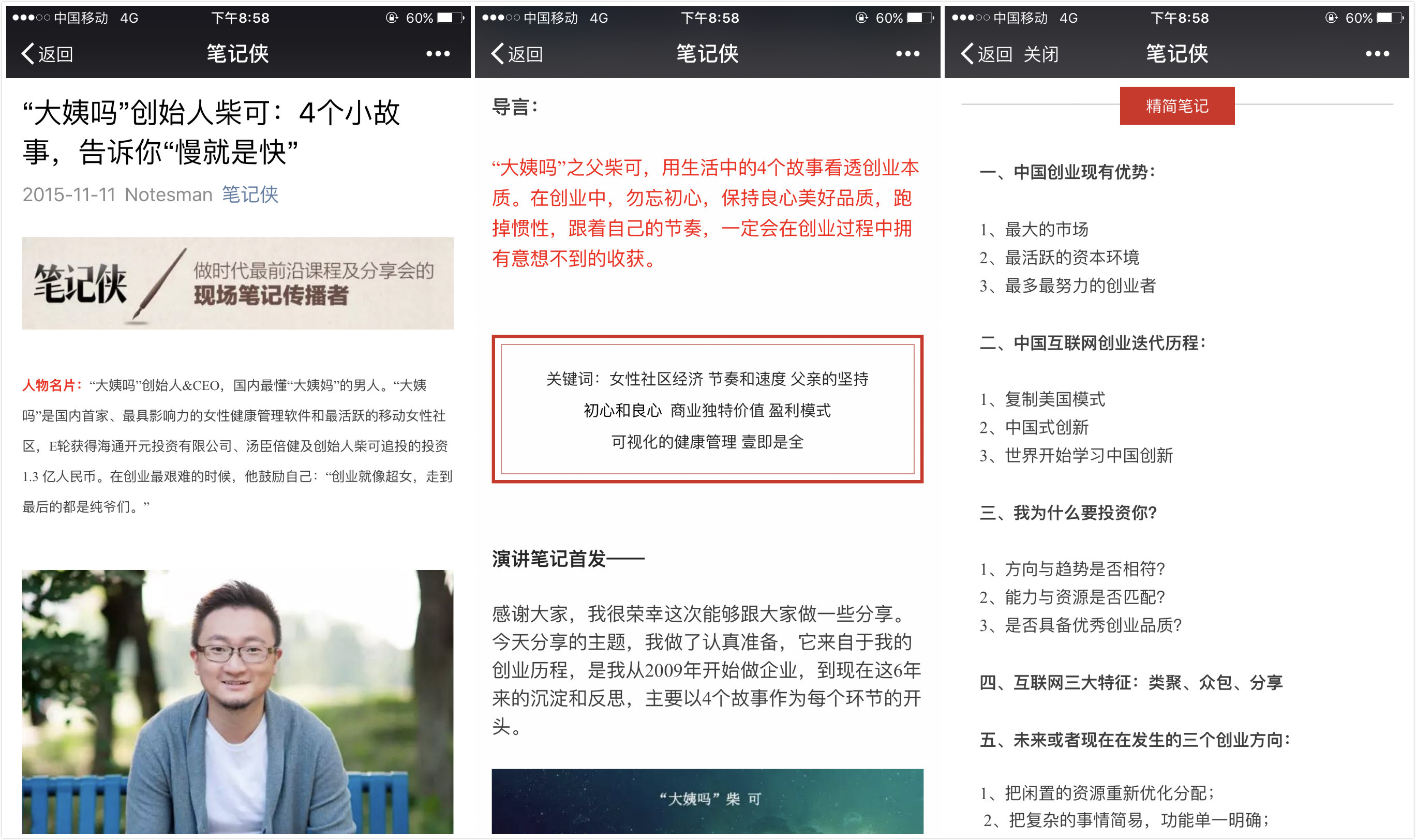 “笔记侠”在做这样一件事:他们并不原创文章,而是搜罗每天全国各地沙龙、会议、活动中的嘉宾演讲,经编辑记录加工后再分享给读者。