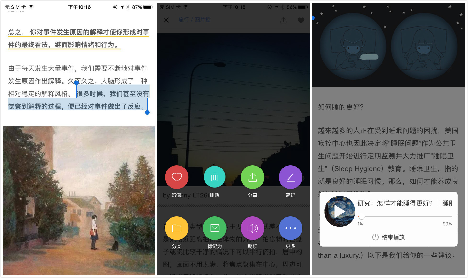 另外,“收趣”还将一些 Pocket 的收费功能免费开放出来,例如 Pocket Premium 里的全文检索、永久储存。打开“收趣”你会觉得这是一款很注重细节体验的产品,阅读文章时直接可以 highlight 关键句做笔记、勾选朗读功能或不同的视图模式。王江说,光是图片的观感他们就调整了好几次,“‘收趣’上很大一部分用户都是 Pocket 上转移过来的,我们不怕去和 Pocket 比。”