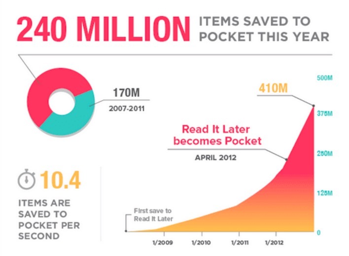 翻看历史数据我们发现,Pocket 的第一轮爆发期发生在 2012 年,Pocket 的用户数在这一年达到 740 万,有 2.4 亿个项目被保存,比过去四年的总和还多。那么,稍后阅读在国内何时才能迎来爆发?