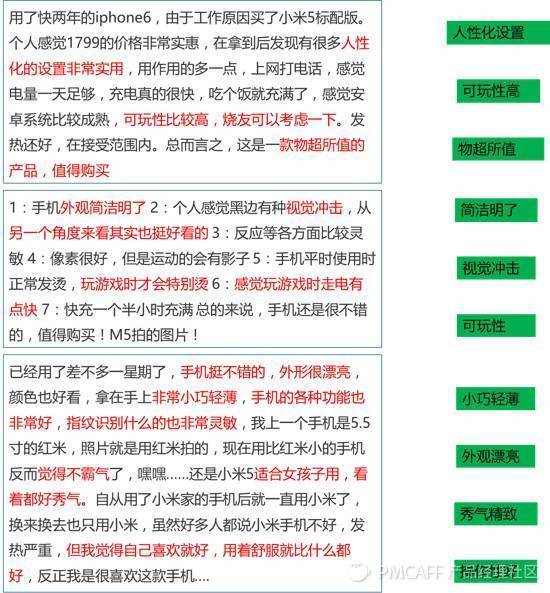 值得注意的是,笔者抽取的三个微博是关于小米旗下不同的产品,在此次用户情感需求挖掘中合在一起进行分析。然而,在实际操作中,此种做法不太严谨,需要对单个产品的微博进行分析。作为案例分析,只是通过具体case来提供一种考虑问题的思路,所以笔者就没有太过“严谨”。但大家在实际操作时,具体产品具体分析。因为不同的产品往往针对不同细分领域的用户,就像小米Note和红米Note,针对的细分人群就不一样。