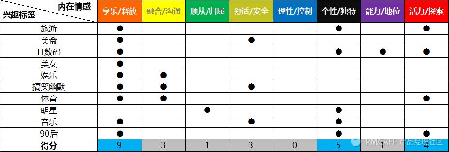 结合Censydiam消费动机分析模型,再根据我们日常对上述兴趣的理解,即我们能从这些兴趣中满足哪些情感需求。每个标签按照情感倾向度优先级进行选取,采用累计计分的形式进行统计。从而得到如下“兴趣-行为动机”对应表: