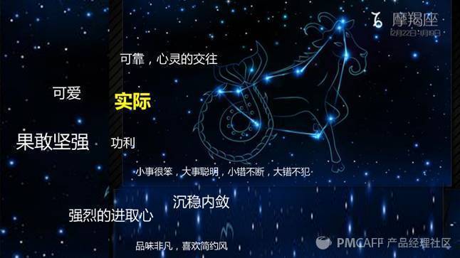 其中,从上图可以看出,在小米现有粉丝/用户中,属摩羯座的人数最多,最具代表性,其次是天秤座、天蝎座。我们主要来看下摩羯座有什么样的人格/性格特征。