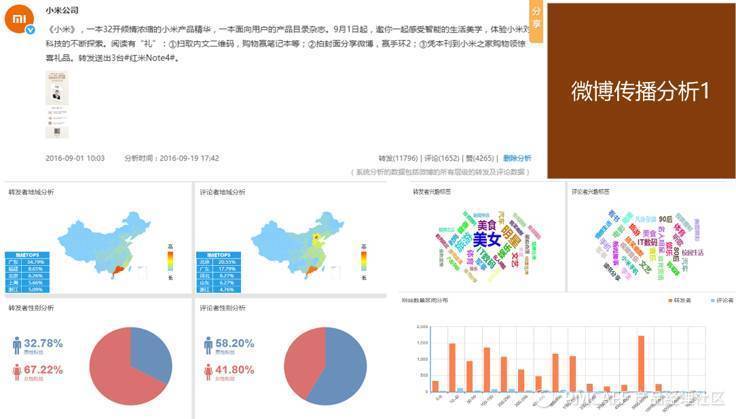遵照上述几条,我分别选取了小米旗下的2个微博账号中的3条转发量较大的微博进行了微博传播分析,它具有刻画传播路径、洞察关键人物、解读用户画像、分析传播质量等功能,本文用到的是其中的解读用户画像功能。