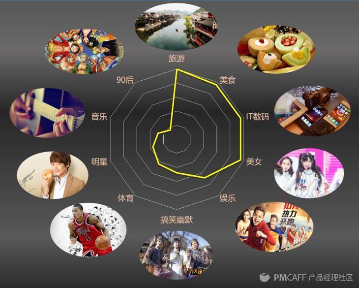 取其中较为明显的10个兴趣标签,从而得到如下粉丝的兴趣图谱雷达图。